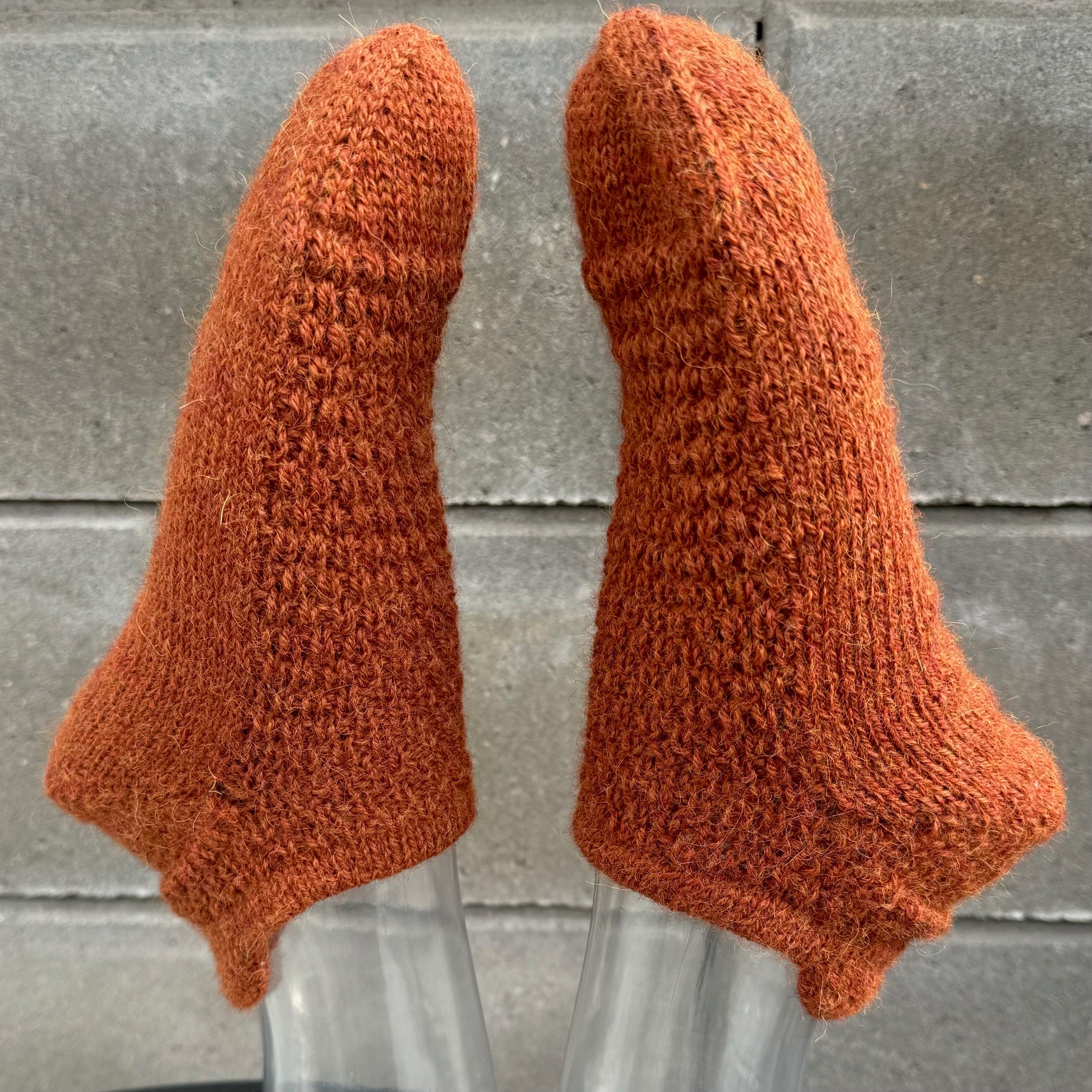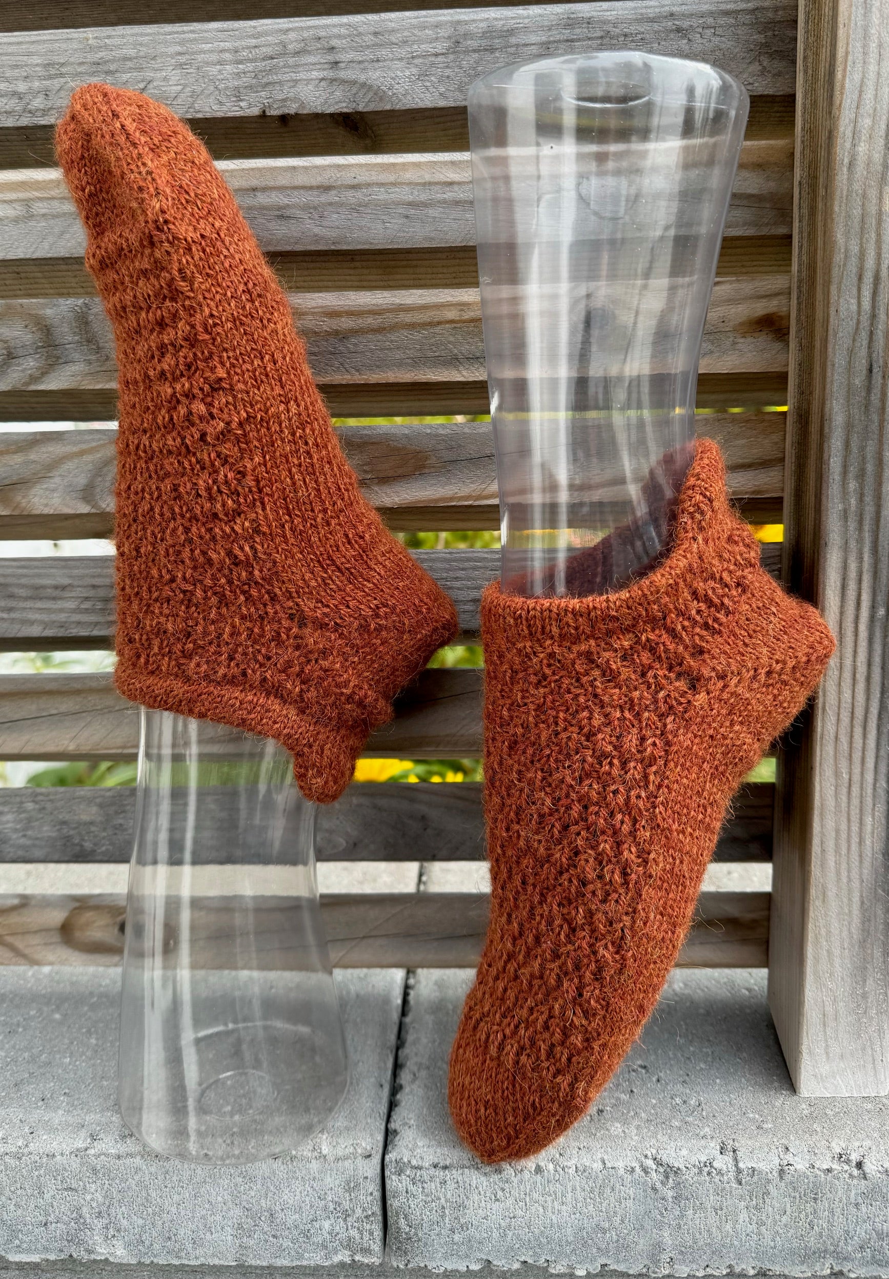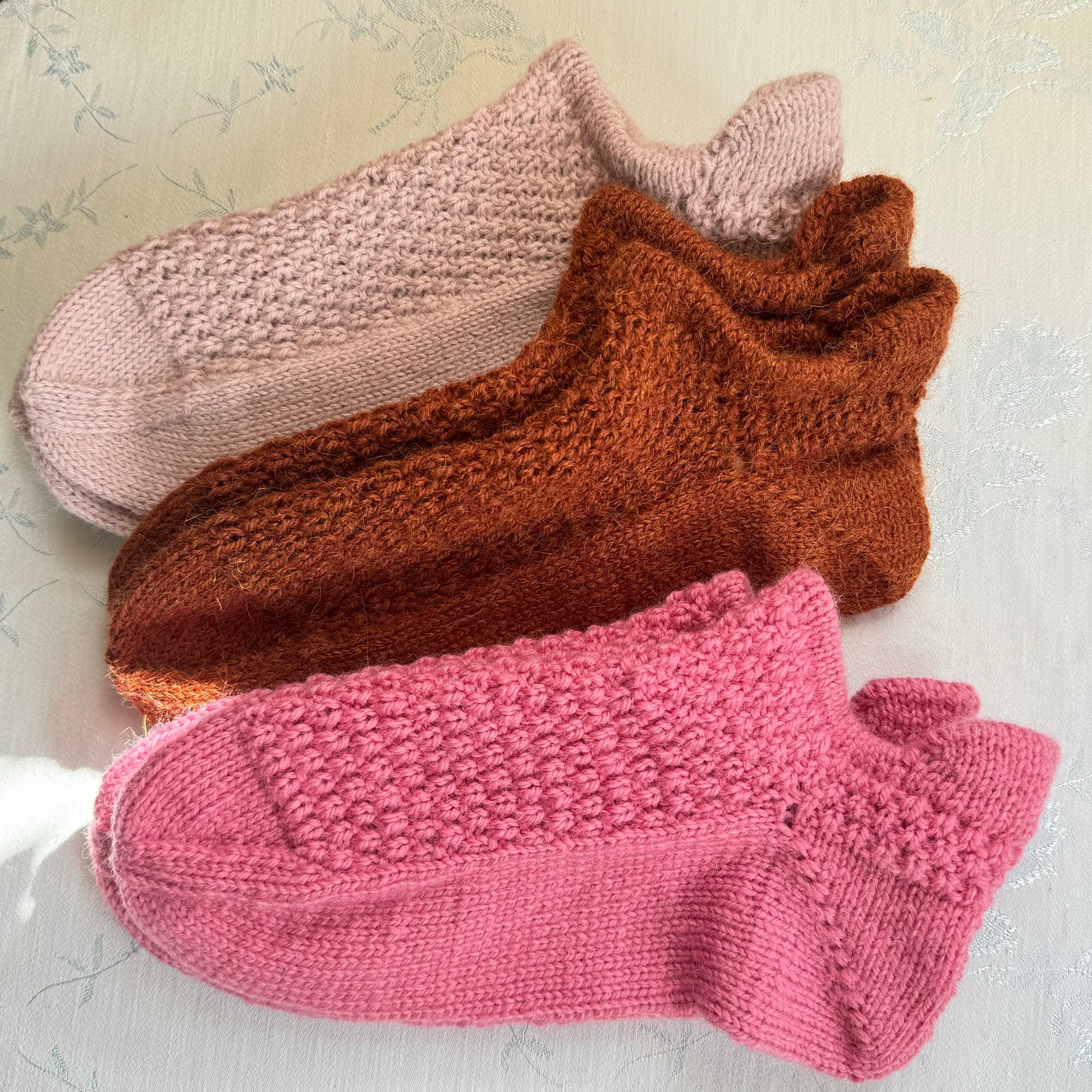 Konstruksjon: Sokker strikkes ovenfra og ned med kort-rads-hæl, her har jeg lagt inn to typer de kan strikkes i, eller du kan også strikke den hæltypen du selv ønsker. Fotens overside og skaftet strikkes i strukturmønster, det er også laget en forhøyning bak som lages i glattstrikk som en brettekant.