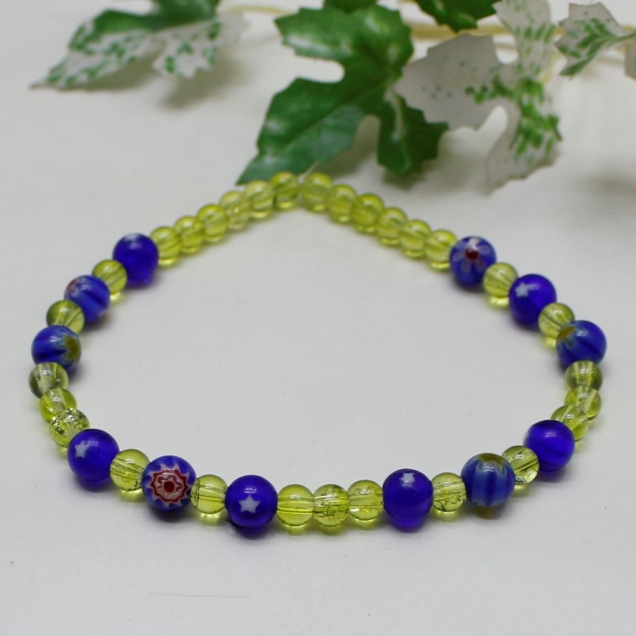 Håndlaget armbånd i blå- og grønne glassperler. Hvorav de grønne er gjennomsiktig og krakkelerte.