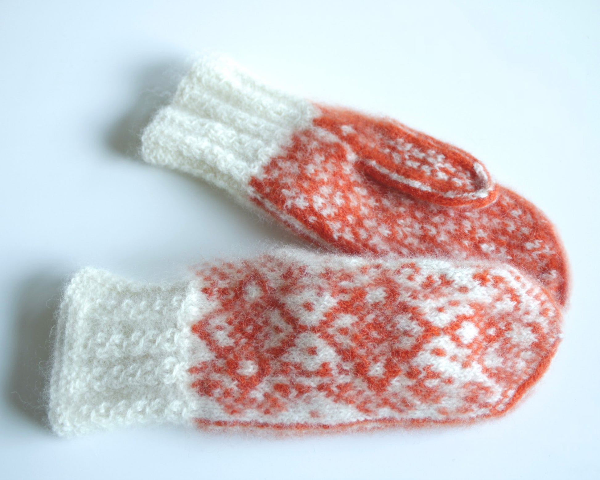 Tova votter strikket i mellomtykt ullgarn og tovet. Vottene har motiv av multebærblomster.