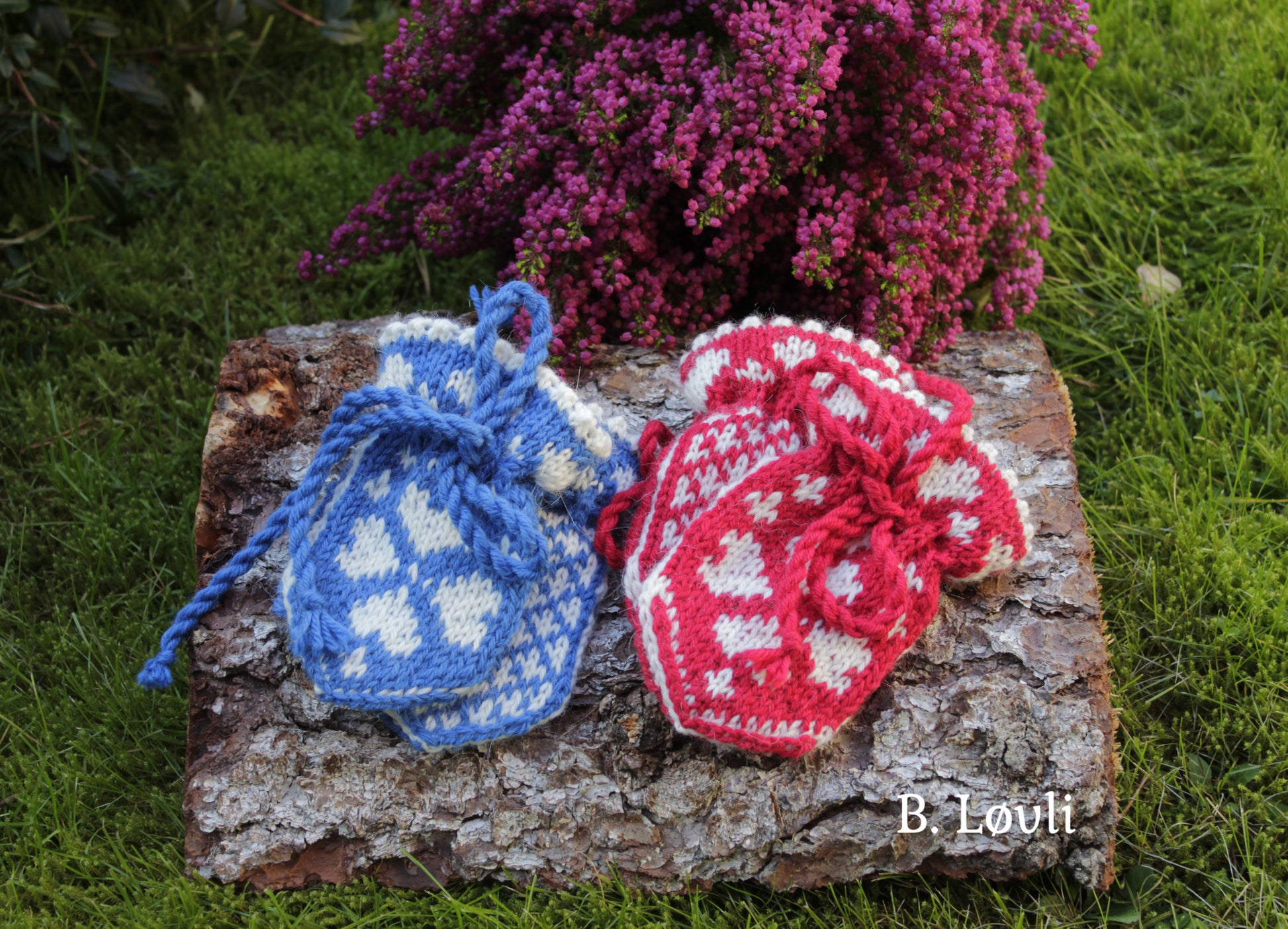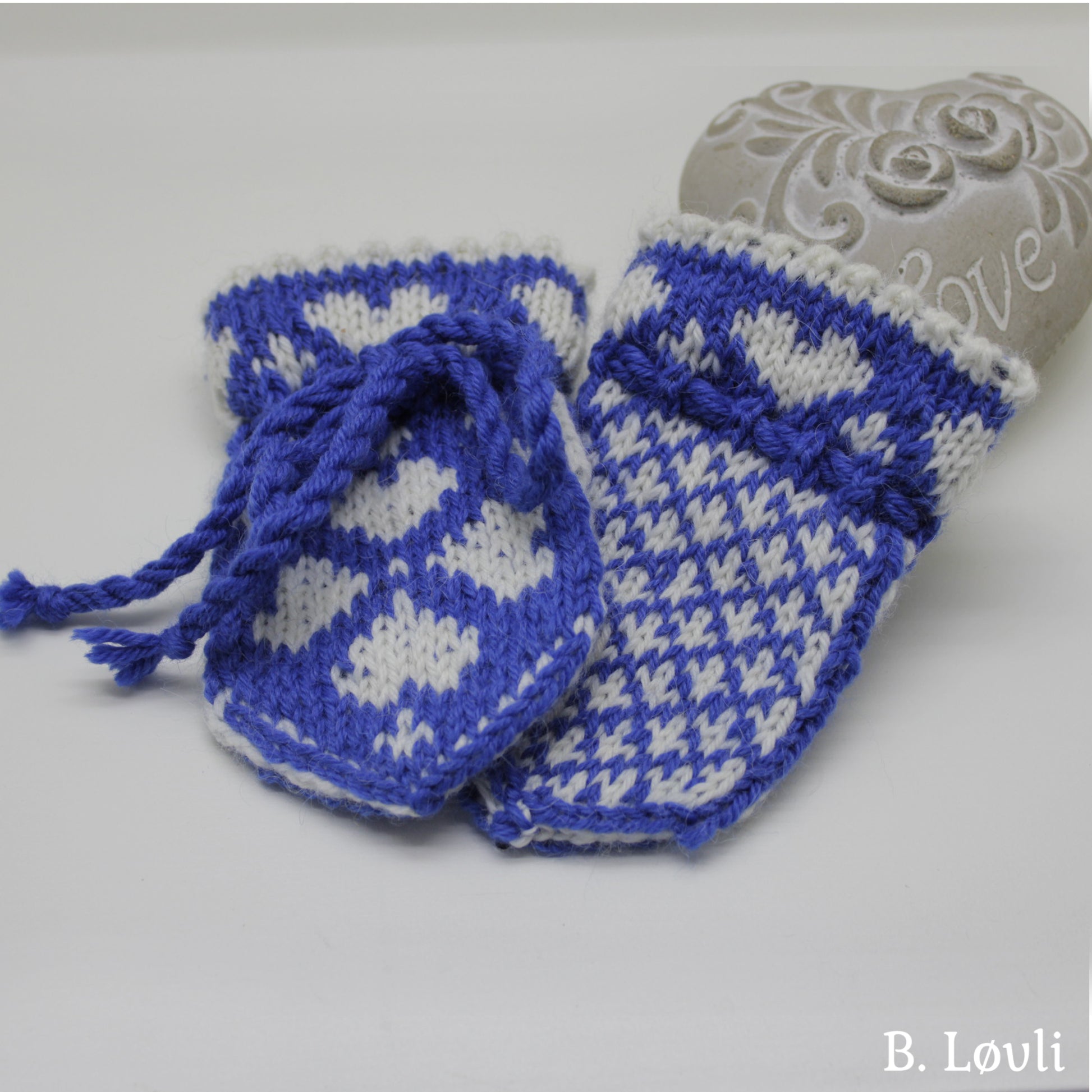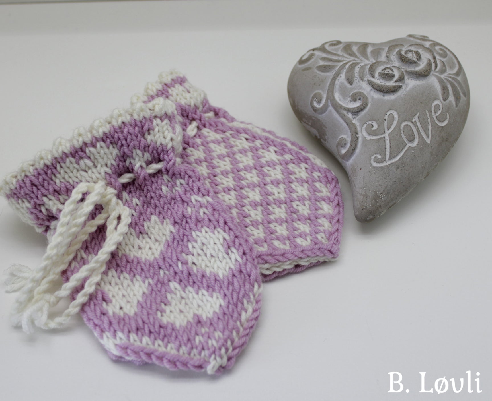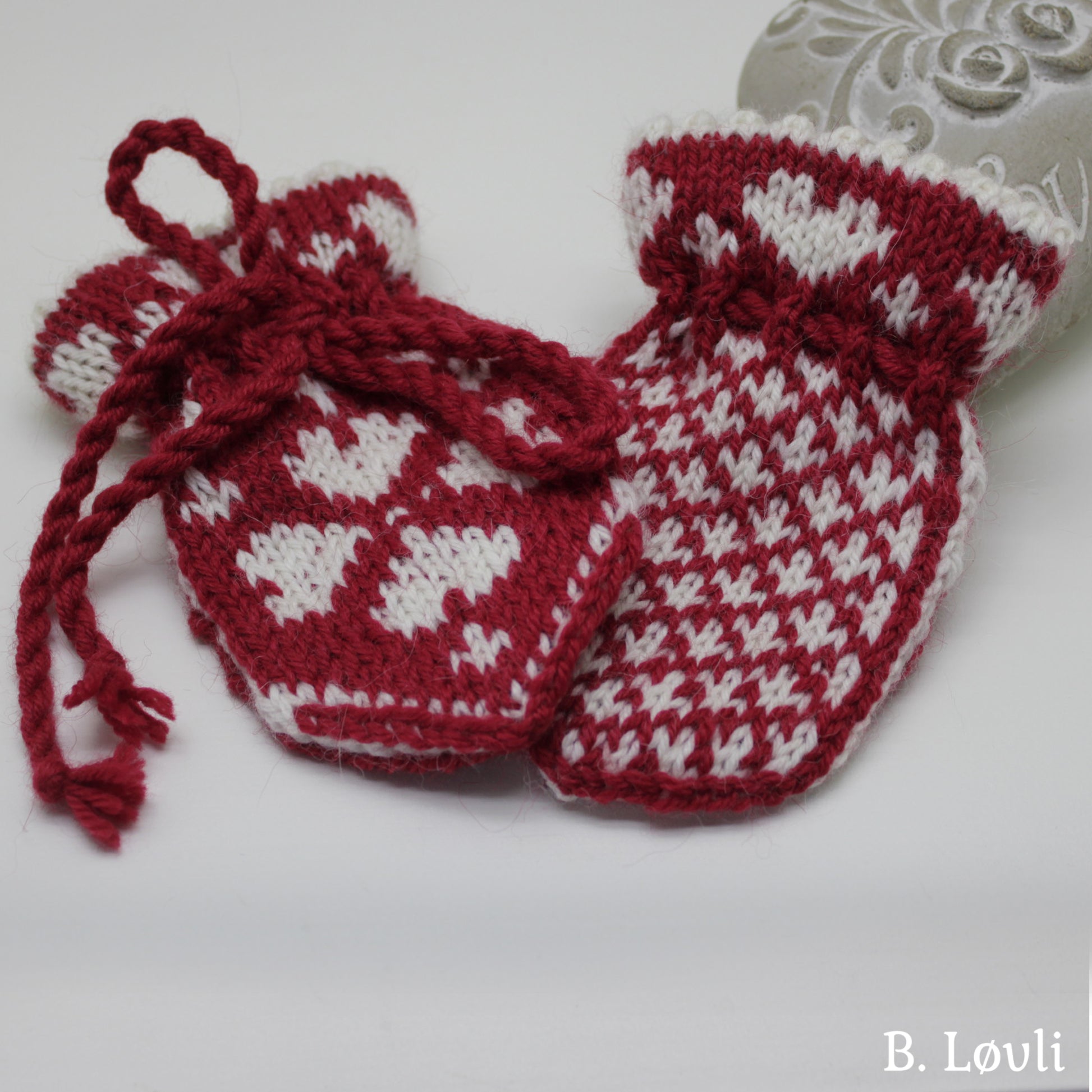 Søte babyvotter i selbuinspirert mønster med hjerter. Strikkes uten tommel.