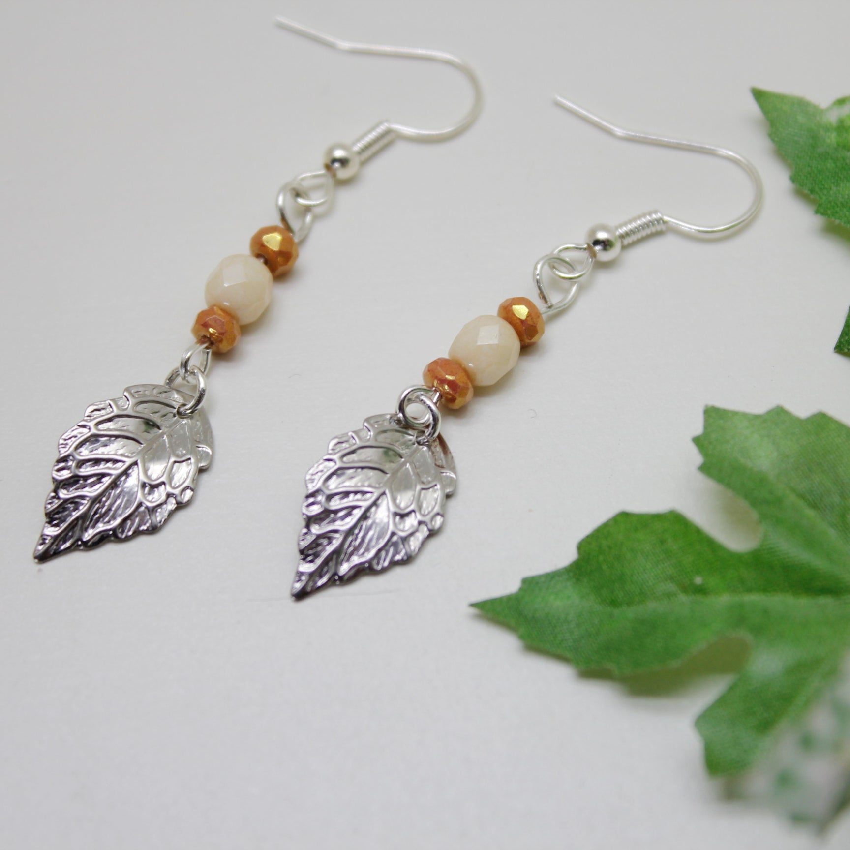 Håndlaget ørepynt med blad i metall, lys brune og beige fasettslipte glassperler. Krokene er sølvbelagte.
