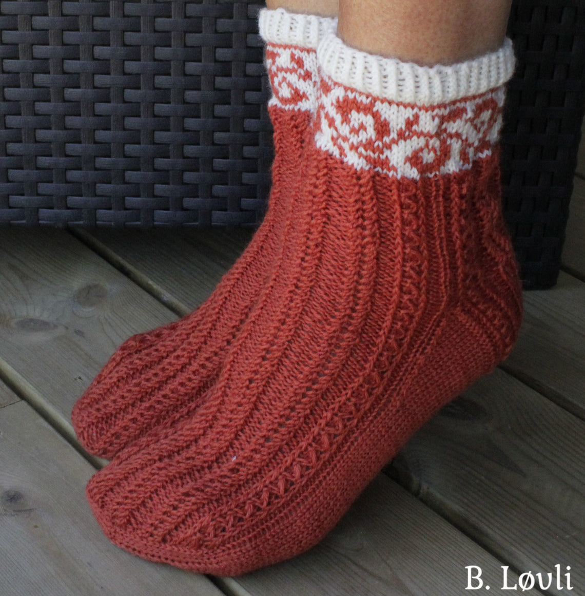 Garnforslag: Sandnes Sisu, Swerger Opal, Flicolana Arwetta Classic, Hot Socks Pearl eller Zitron Trekking 4-tråders. Bruker du tynnere garn/mindre pinner, eller tykkere garn og tykkere pinner blir også sokkene mindre eller større.
