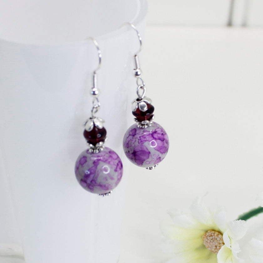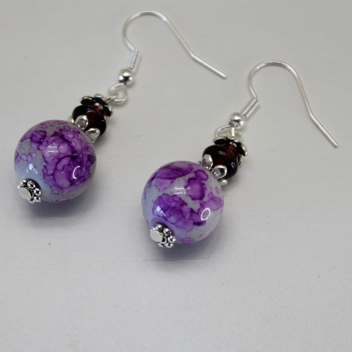 Håndlaget ørepynt i rosa og grått med sølvbelagte kroker.