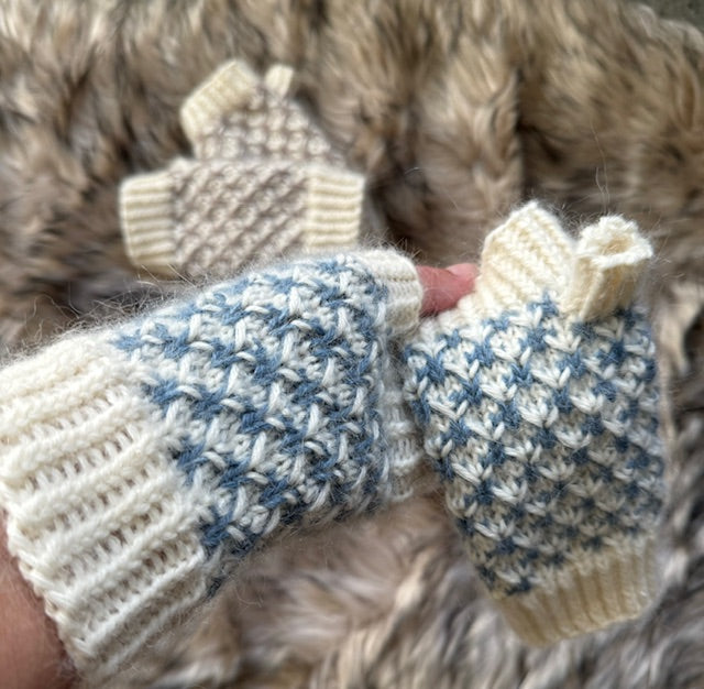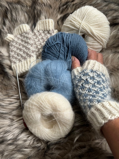 Det strikkes med begge garntypene samtidig. Bruk også gjerne andre typer garn som du liker.