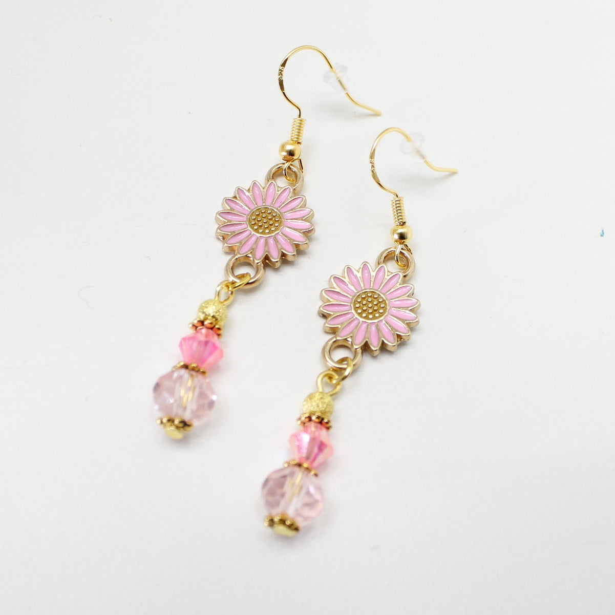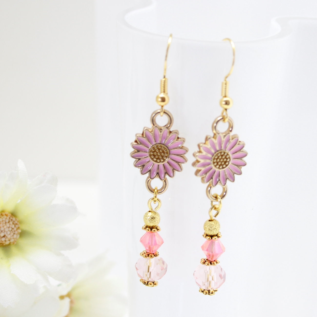 Materialer: Gullbelagte kroker sterlingsilver 925, glassperler, stardust perler, charms med emaljert blomst. Nikkelfritt