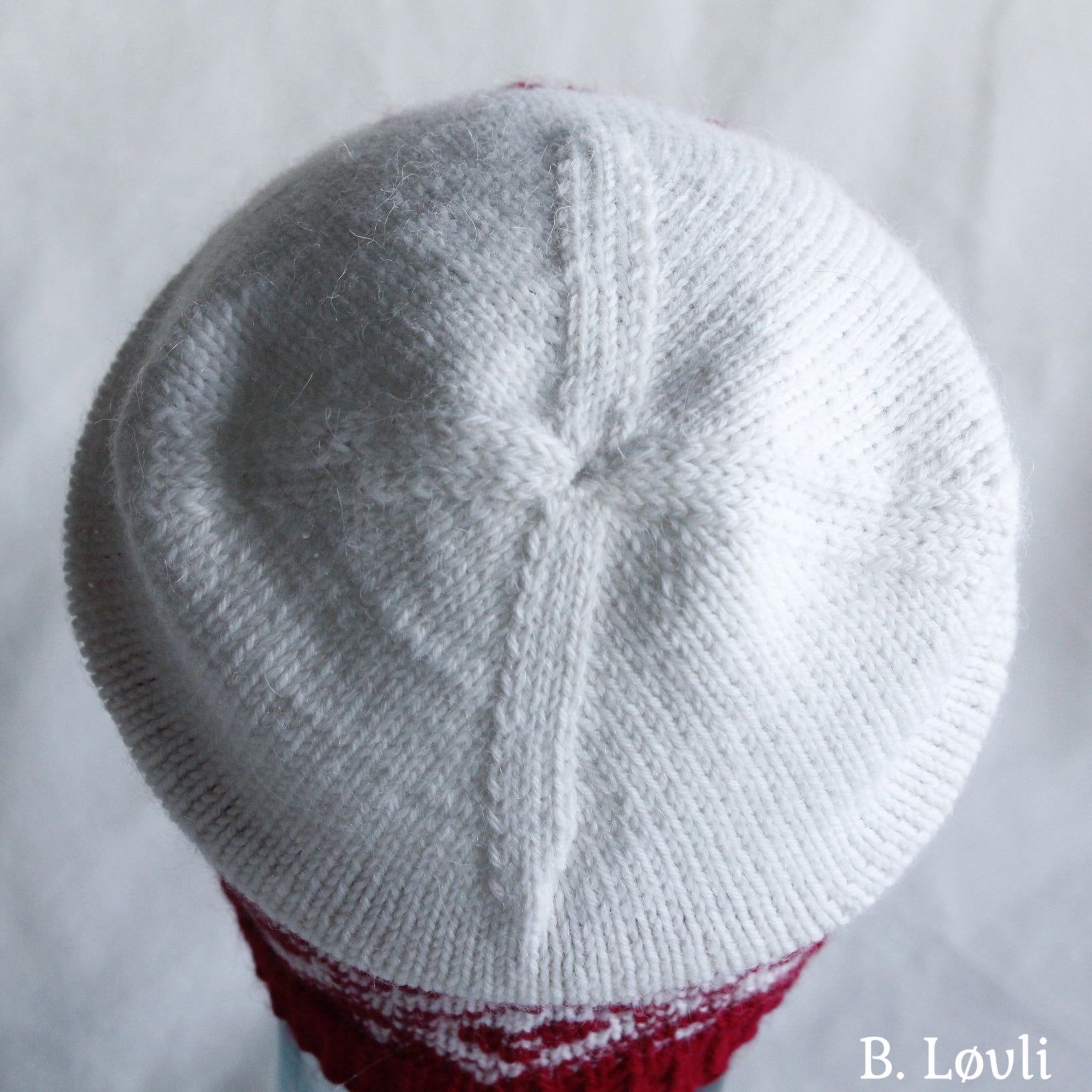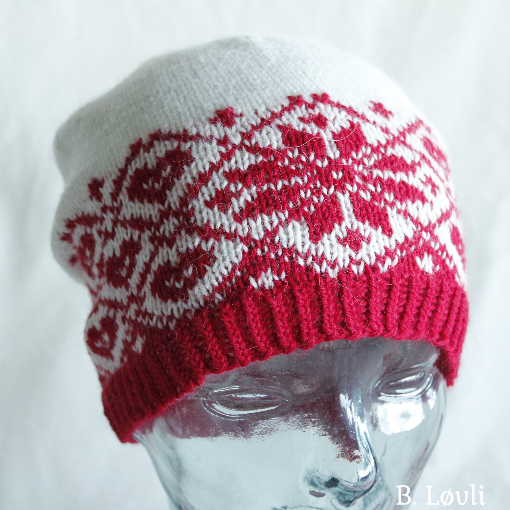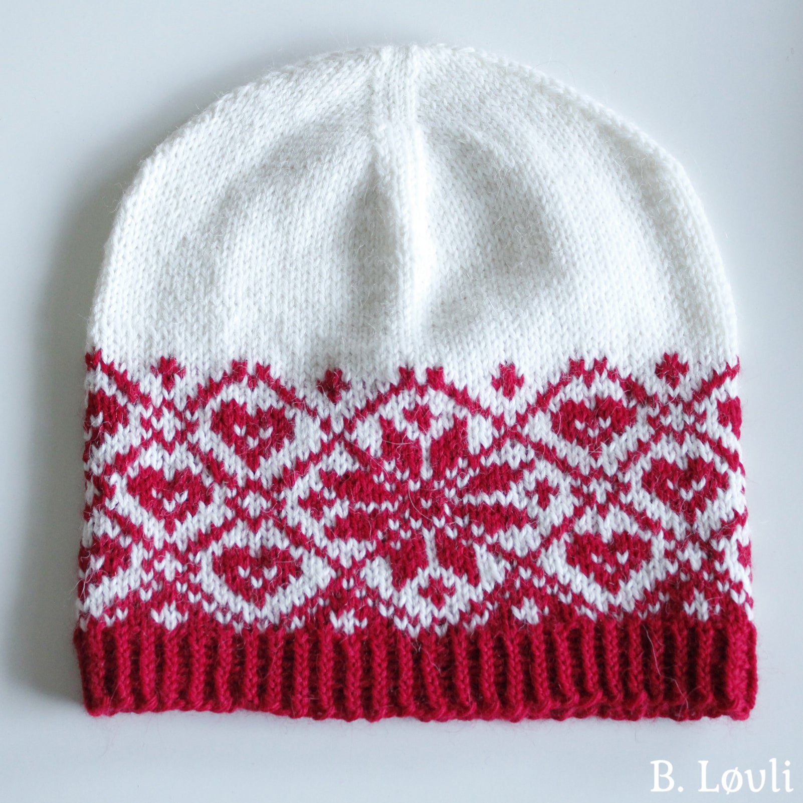 Lue med selburose innkranset i hjerter. Lua er strikket i garnet Sterk, ja du kan også bruke annet garn.