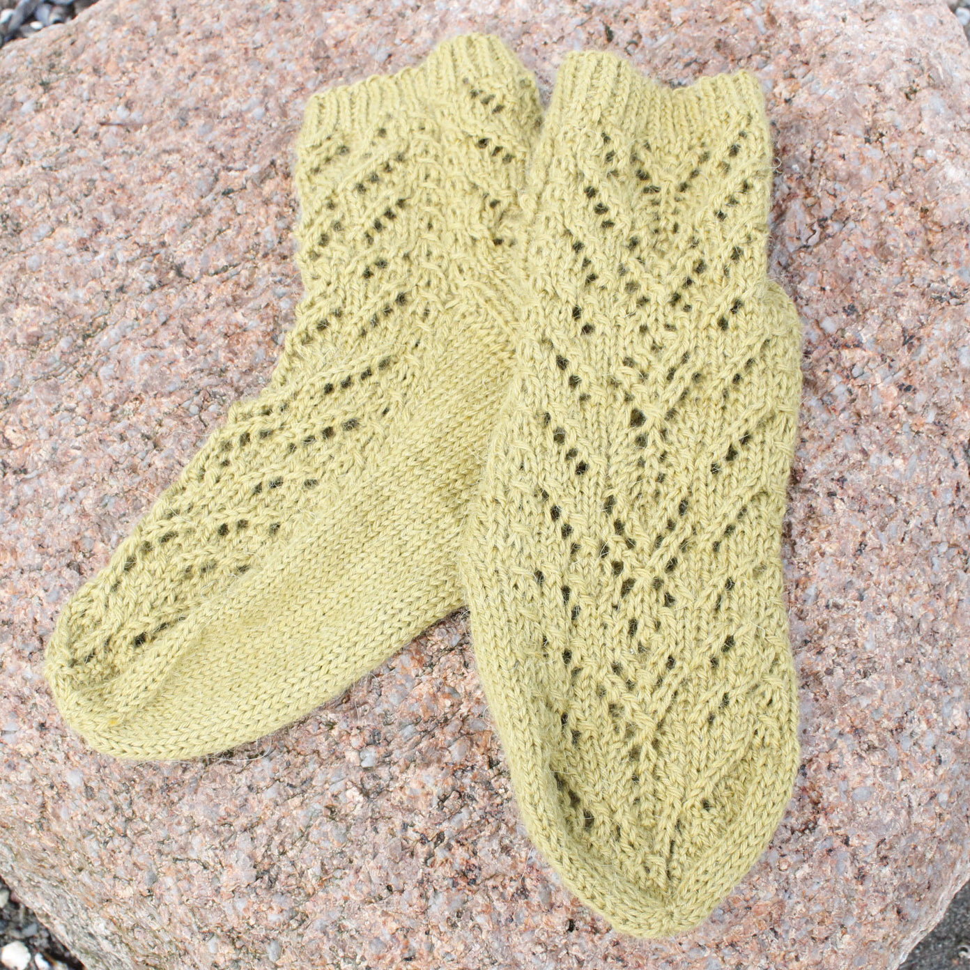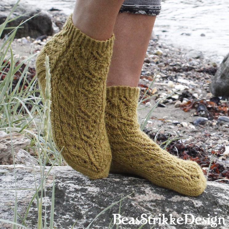 Lekre og varme ankelsokker. Sokkene stikkes rundt på settpinner eller med lang rundpinne som Magic loop