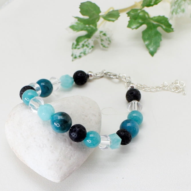 Lekre runde og facerterte stener, med blanke rondeller. Her er brukt amazonitt, jade og lava mm Perlene er tredd sammen på ståltråd med beskyttelse på og låses med karabinkrok.