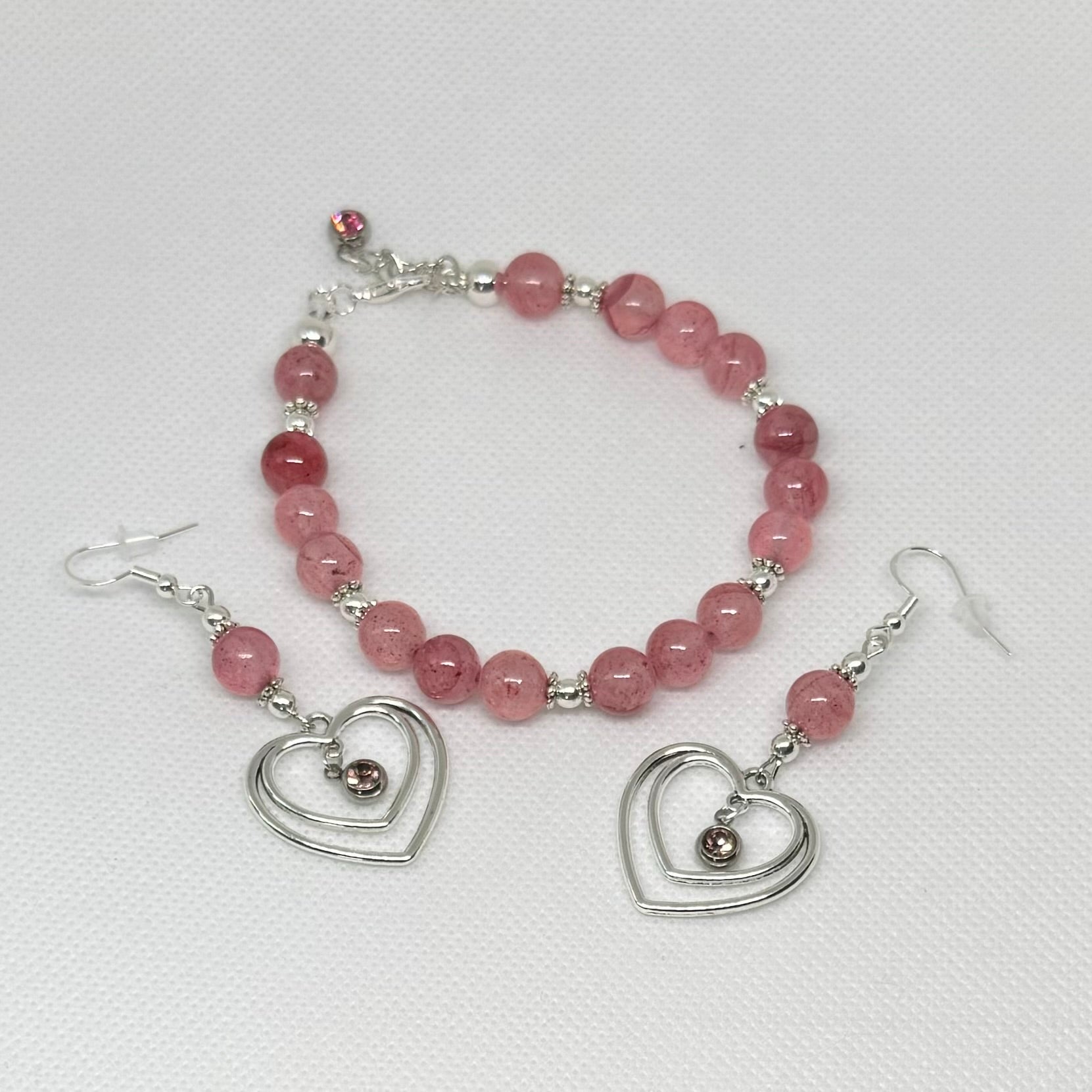 Armbånd og ørepynt i rosa persisk jade og rhinestones