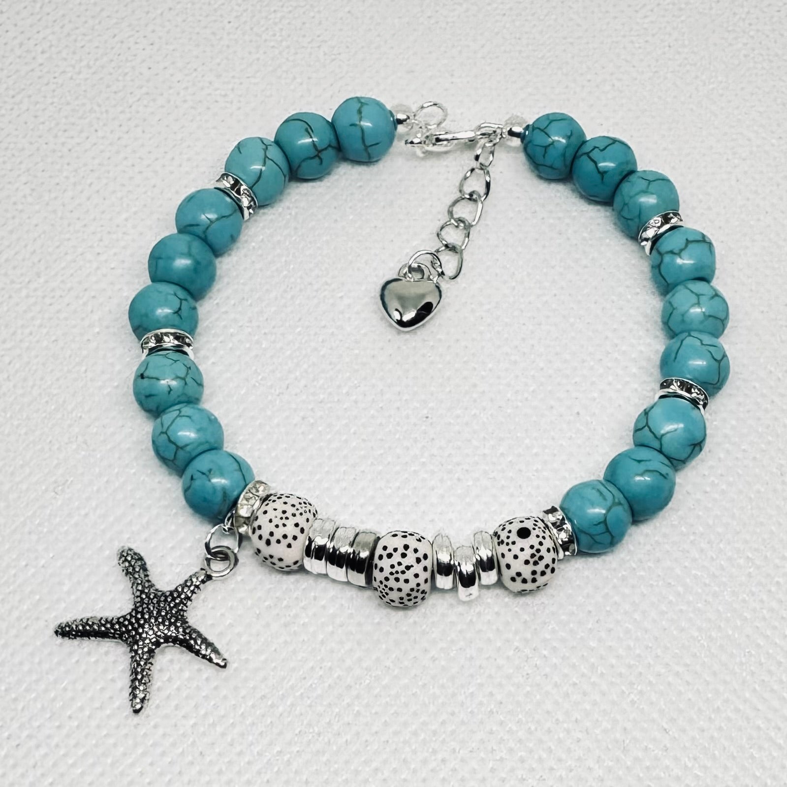 Akrylperler 8mm og glitrende rondeller charms, sjøstjerne og hjerte. Armbåndet er tredd inn på memory-wire, lukkes med karabinlås