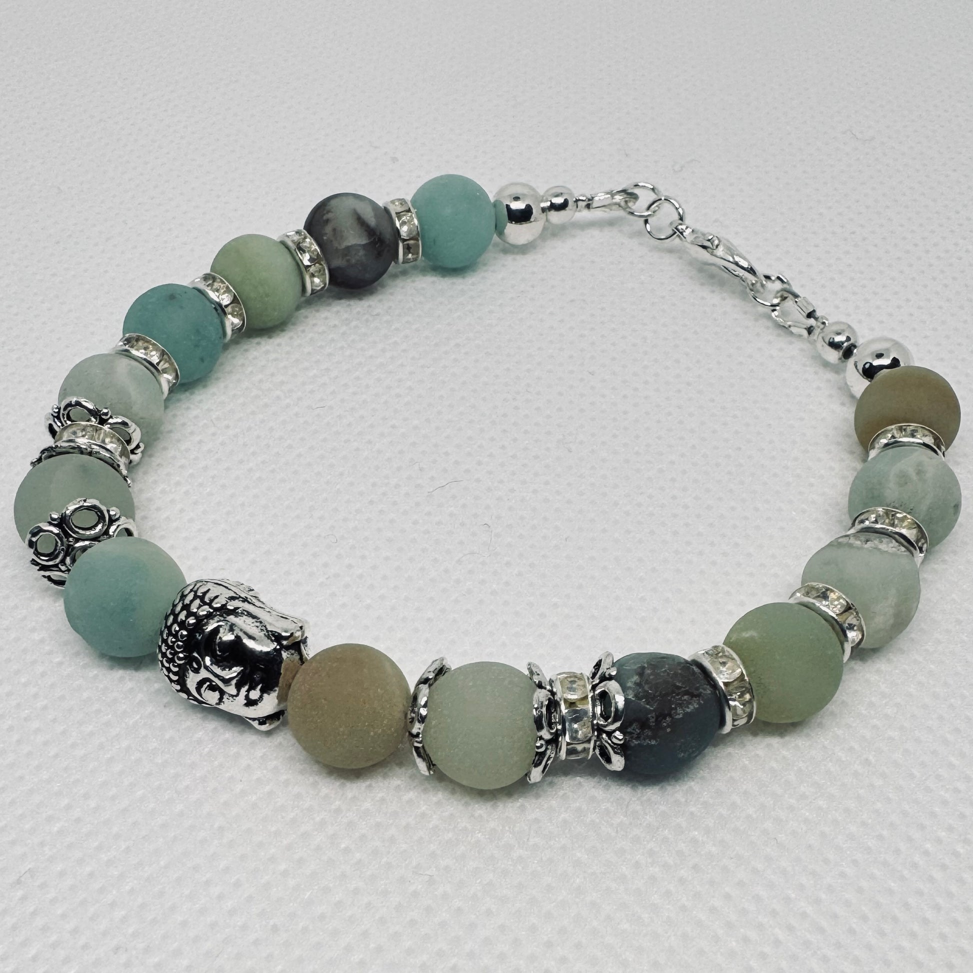 Budda armbånd i matt amazonitt. Lekre runde 8 mm stener, med mellomperler i metall. Perlene er tredd sammen på ståltråd med beskyttelse på og låses med karabinkrok.