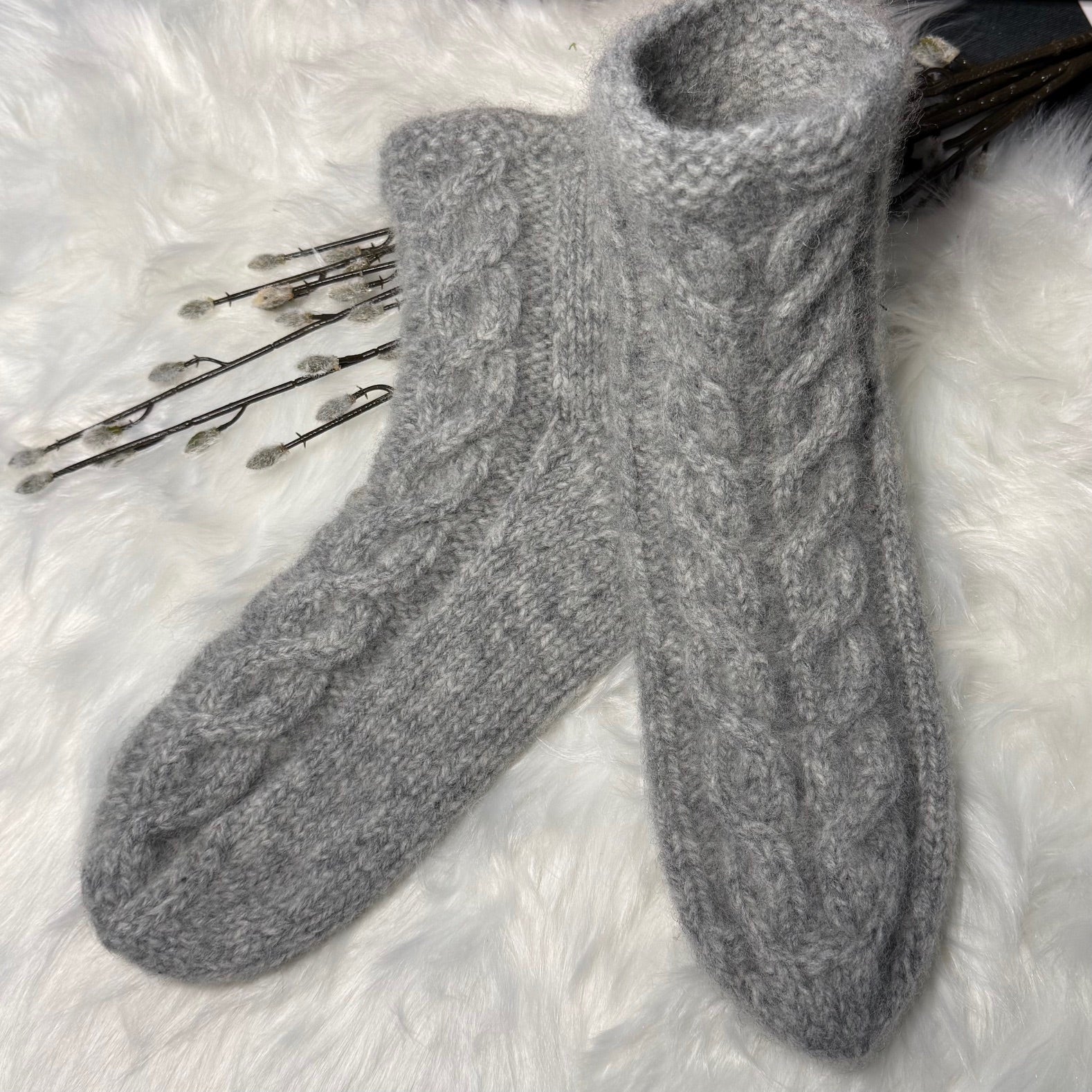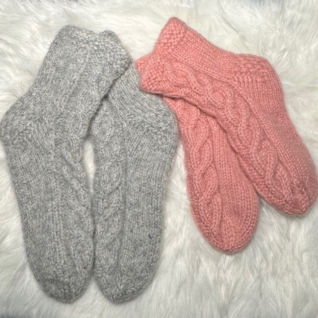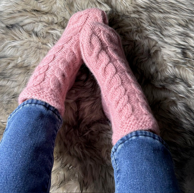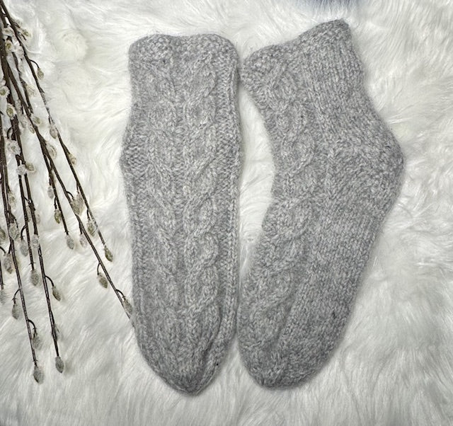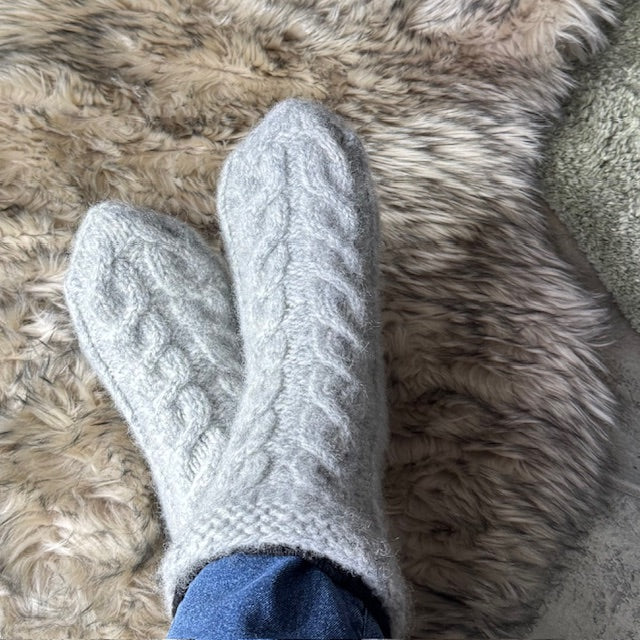 Tykke og gode tova sokker med flettemønster og forsterket hæl. Disse sokkene holder føttene varme og gode