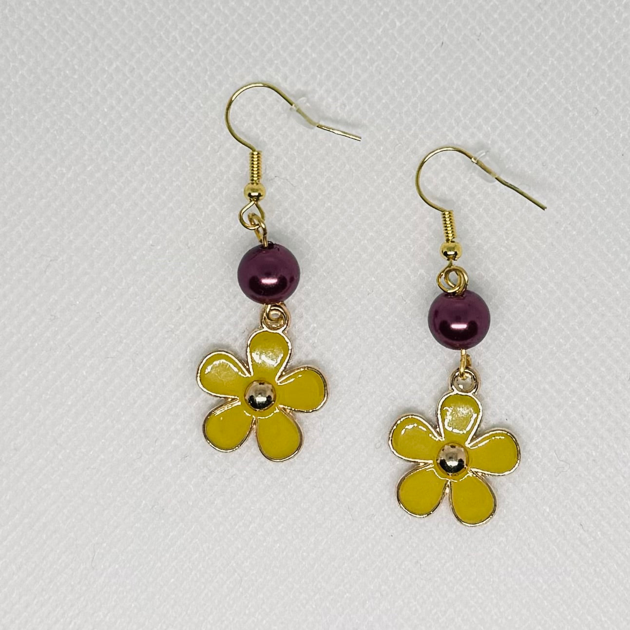 Håndlaget ørepynt med blomst og akrylperle gul og burgunder