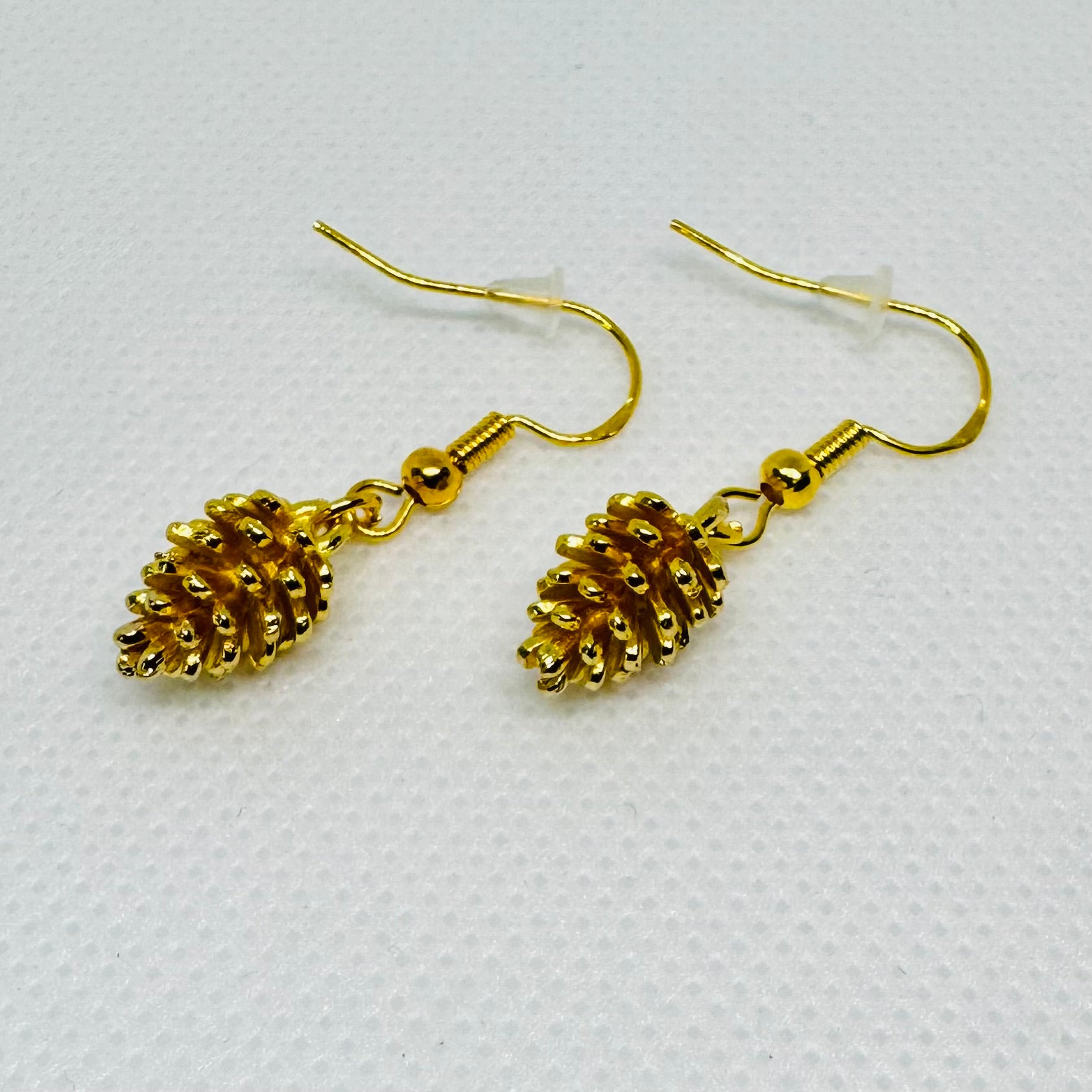 Ørepynt på gullbelagte kroker med motiv av kongler