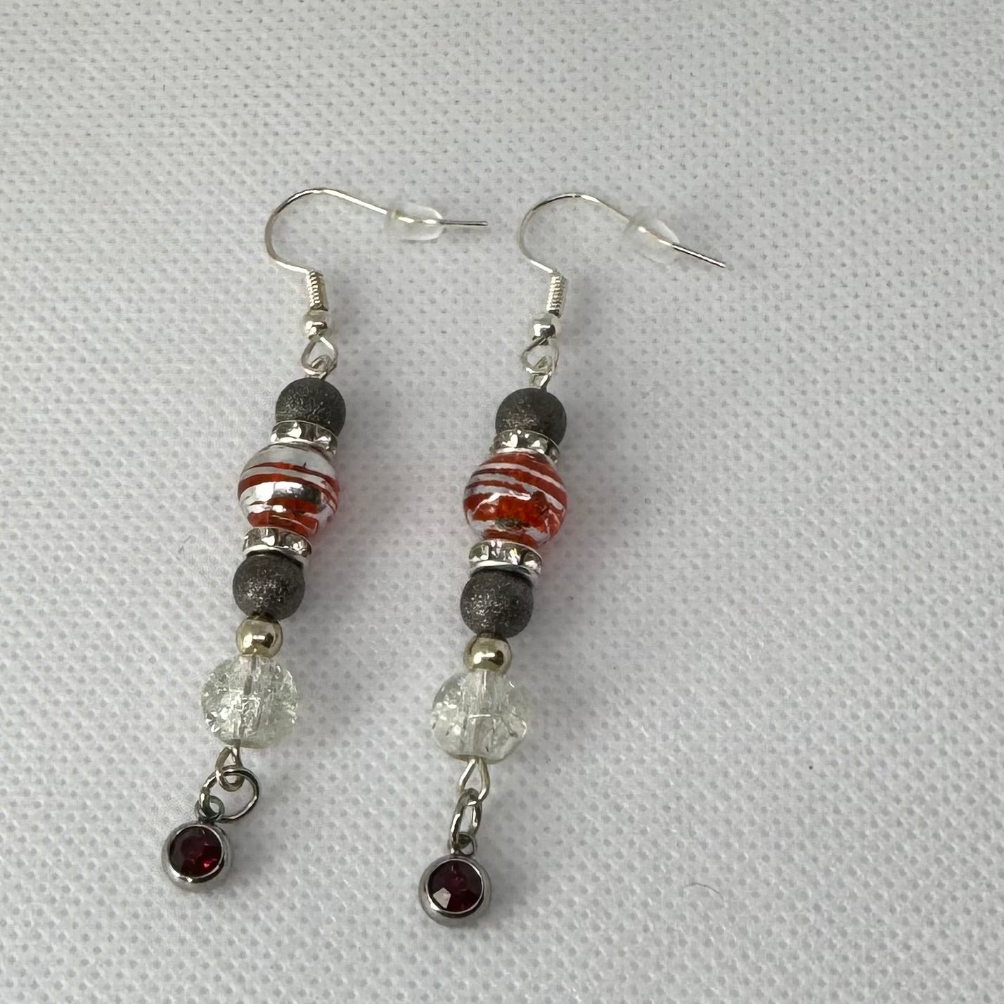 Håndlaget ørepynt med glass perler i varierende størrelser største måler 8mm med gummistoppere. Satt på nikkeltrygge kroker