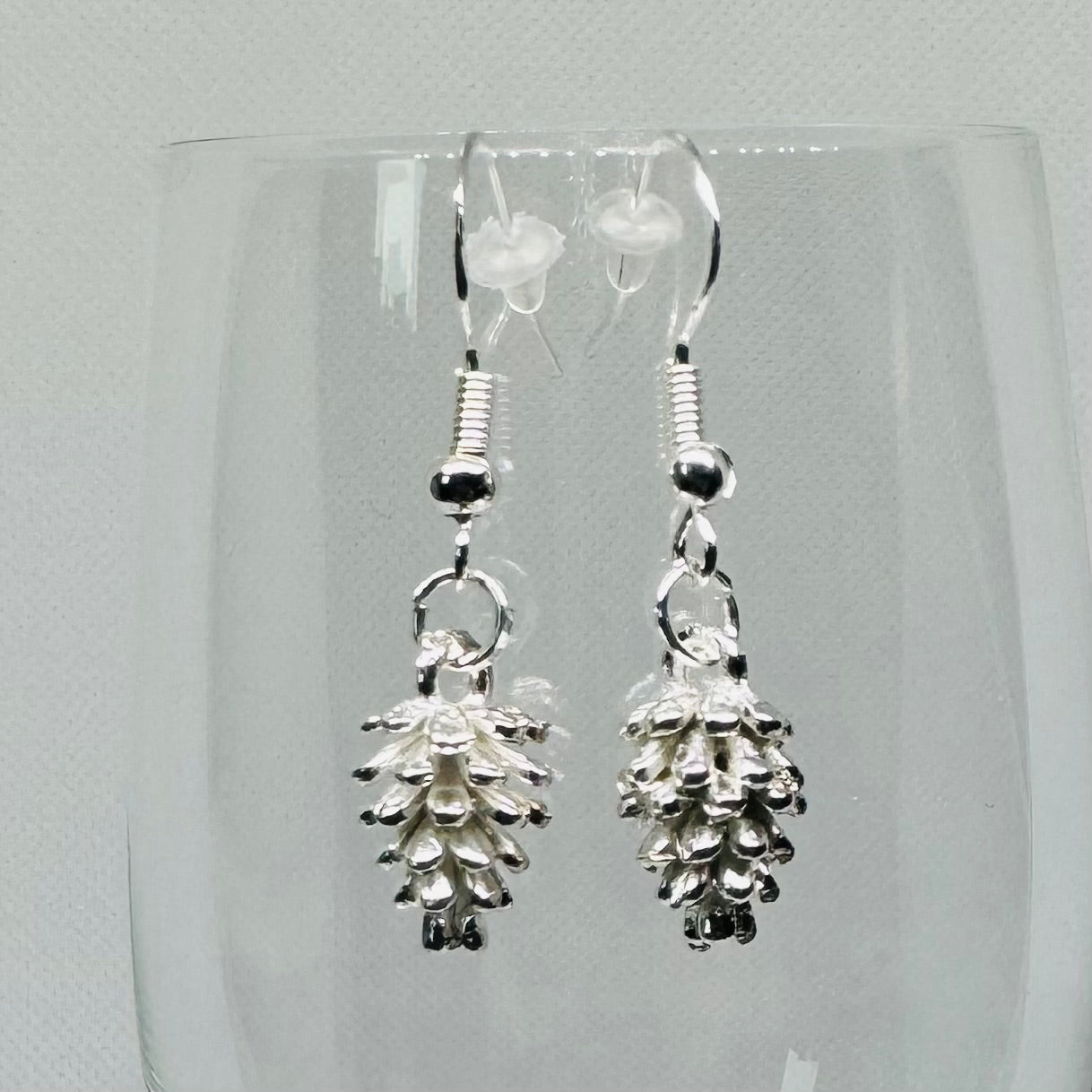 Ørepynt på sølvbelagte kroker med motiv av kongler