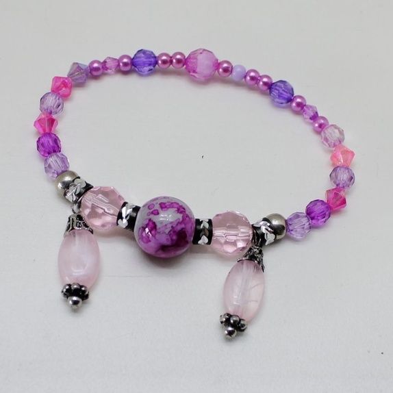 Håndlaget armbånd i rosa og lilla perler. Noen runde andre fasettslipte.