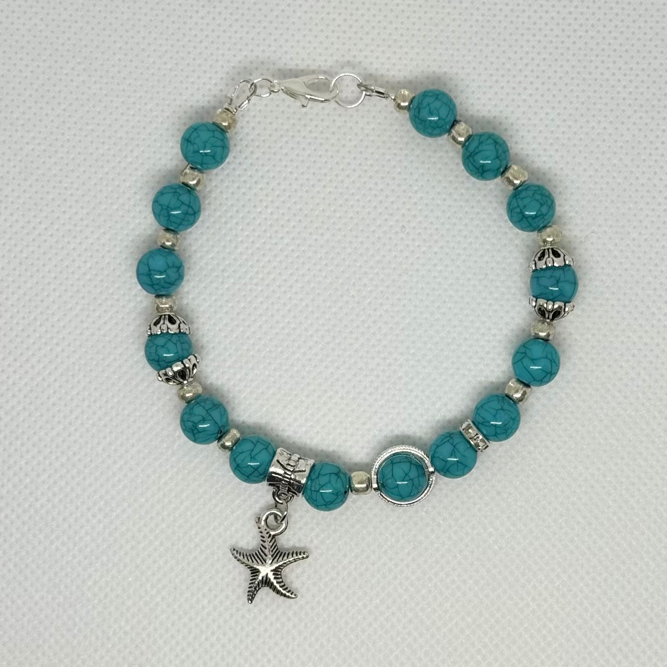 Håndlaget armbånd i turkise med anheng i metall. Armbåndet er satt sammen av 8mm akrylperler - låses med karabinkrok.