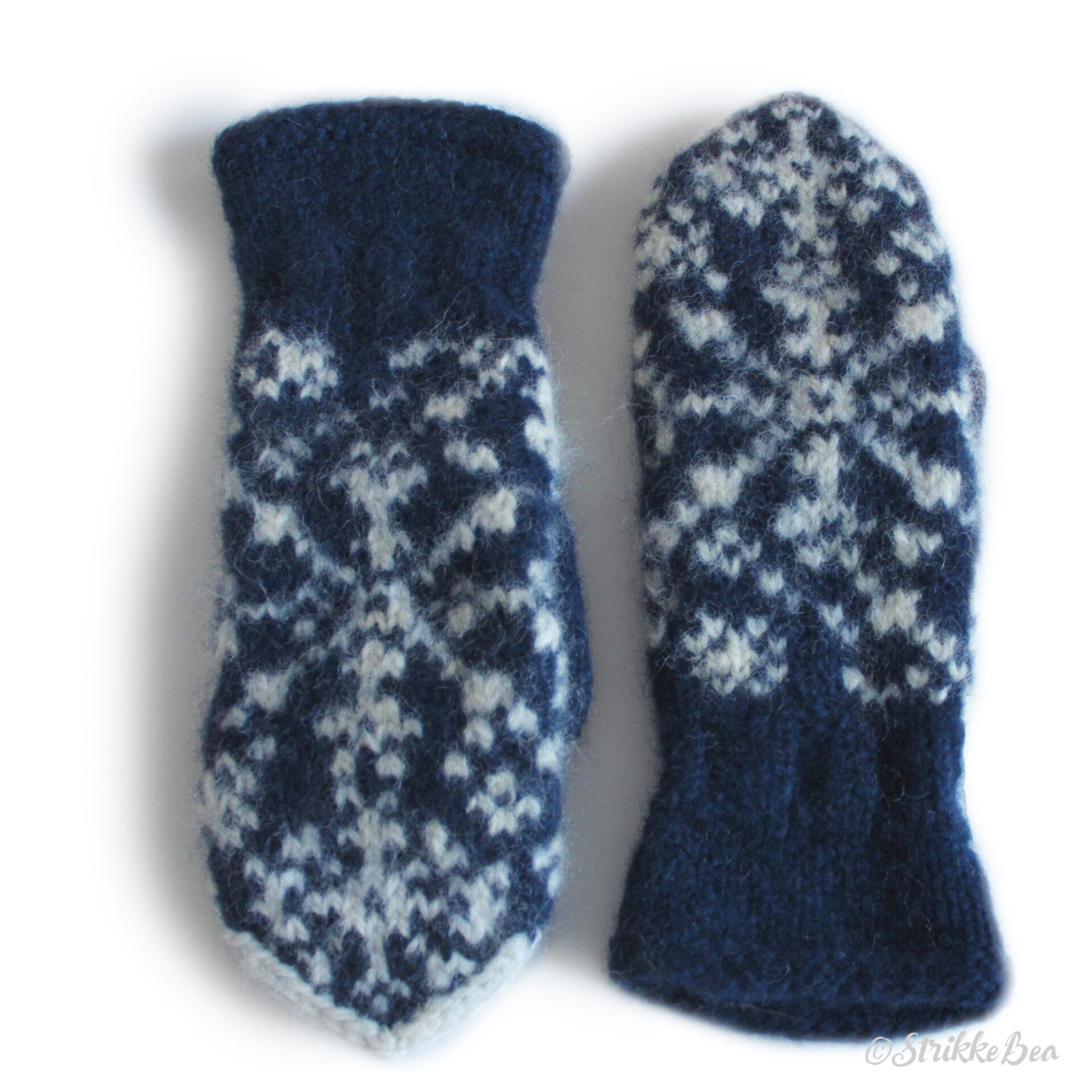 Vottene er strikket i fritidsgarn fra Sandnes på pinner 6mm og mønstret er asymestriske snøflak. Med mønstret får du diagram over både høyre og venstre vott.