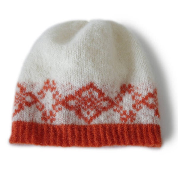 Lett tovet lue i mellomtykt ullgarn- Lua har motiv av multebærblomster.