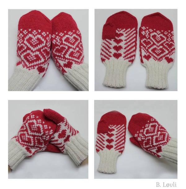 Hjerteflom votter er mellomtykke votter strikket i tumi, enkle votter å justere etter størrelser og eksakt øsket mål. vottene har en mønsterbord som går over ca halve votten.