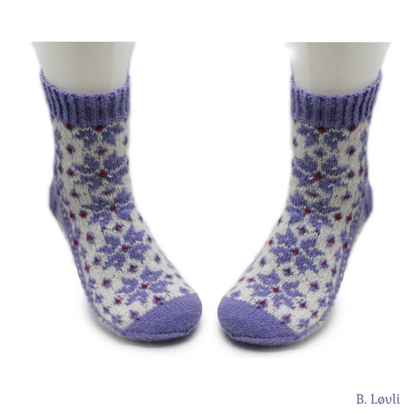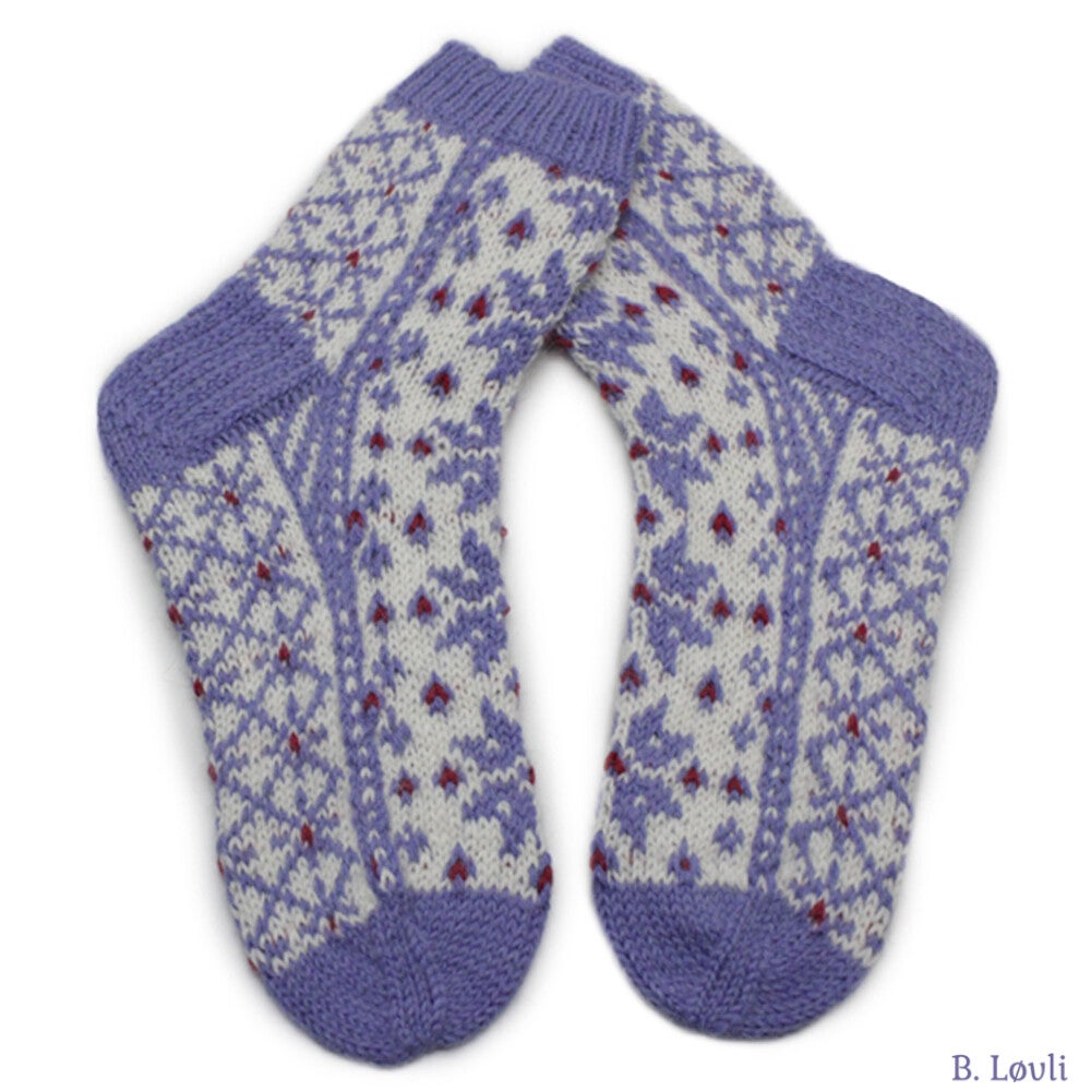 Garn:Sterk fra DSA. Kan også strikkes ipt5 Sport, Viking of Norway Sportsragg. Bruker du tynnere garn/mindre pinner, eller tykkere grn og tykkere pinner blir også sokkene mindre eller større.