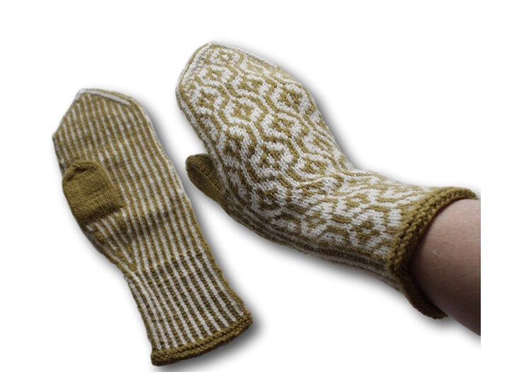 Flotte mønstervotter i et mønster som er både klassisk og morsom å strikke. Vantene passer til normal damehånd og de sitter godt på hånden. Til disse trenger du 1 nøste av hver farge