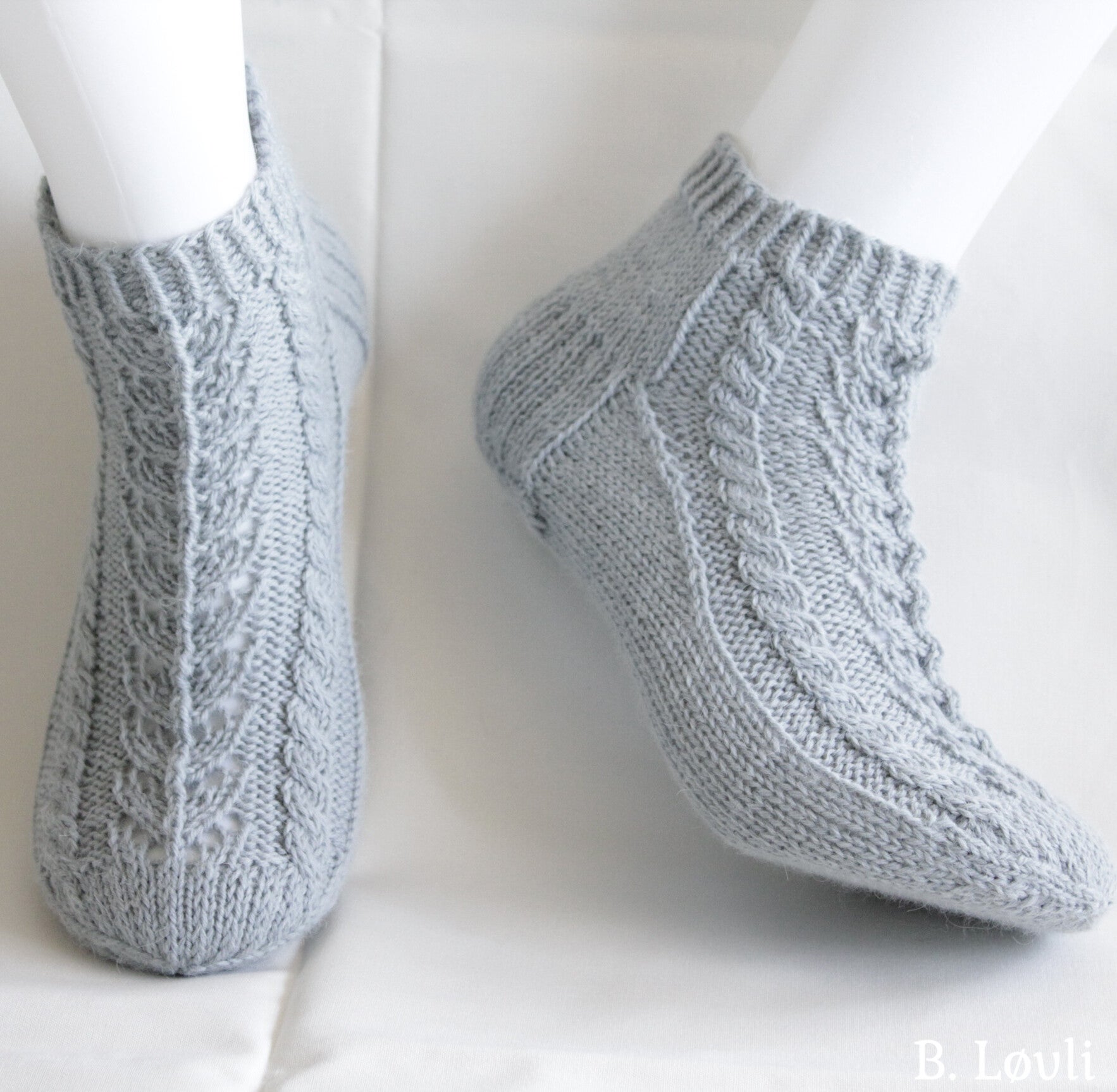 Ankelsokker med fletter og hullmønster av halve blader. Sokkene strikkes med forsterket hæl og tå. Eller om du ønsker å strikke dette slik du pleier kan du også det.