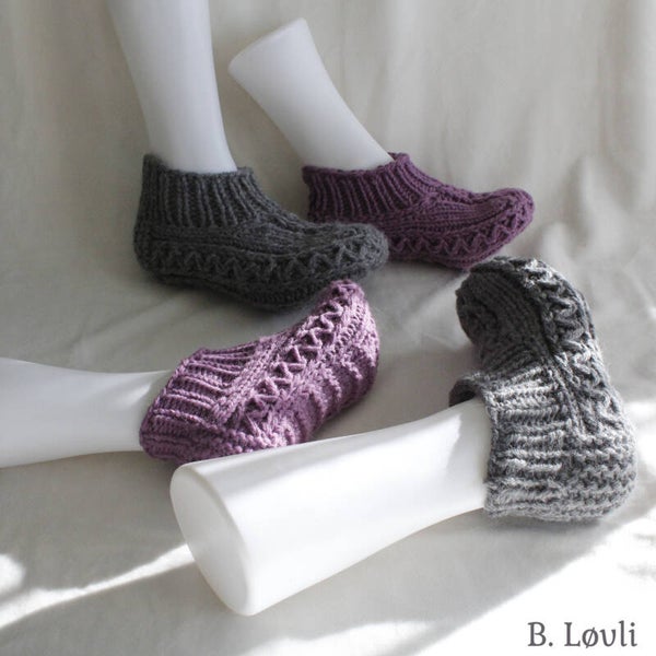 Tykke og varme tøffe tøfler som strikkes i alpakka ullblanding. Strikket i ulike teknikker. Mønstret har diagram og forklaringer.