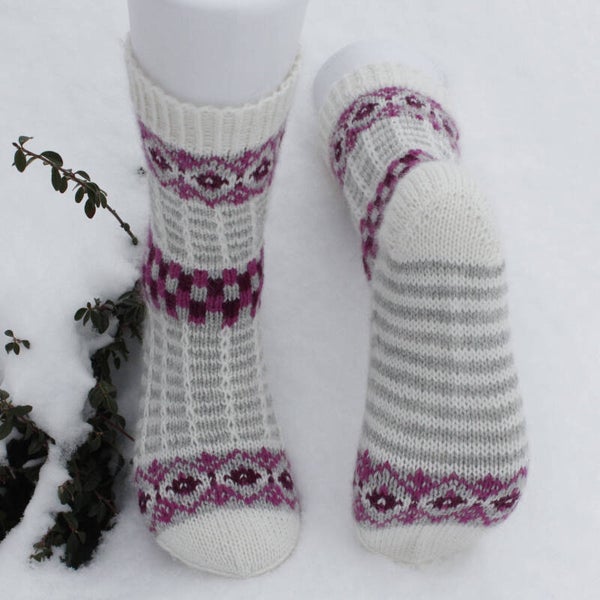 FrostIs er sokker strikket i mellomtykt strikkegarn på pinner 2,5 og 3. Dette er sokker som er lett å justere i