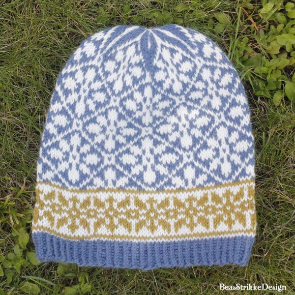 Skogsrosemønstret er veldig greit å strikke med få lange fargesprang, (noen få omg der det er 5 masker på rad) ? Oppskriften har diagrammer med forklarende tekster.