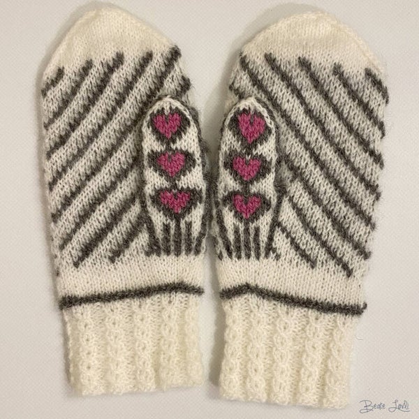 Lett tova ullvotter med motiv av hjerter i skog. Oppskriften har gode forklaringer, diagram for hver vott, det strikkes med kiletommel og det er brukt falske fletter og maskesting.