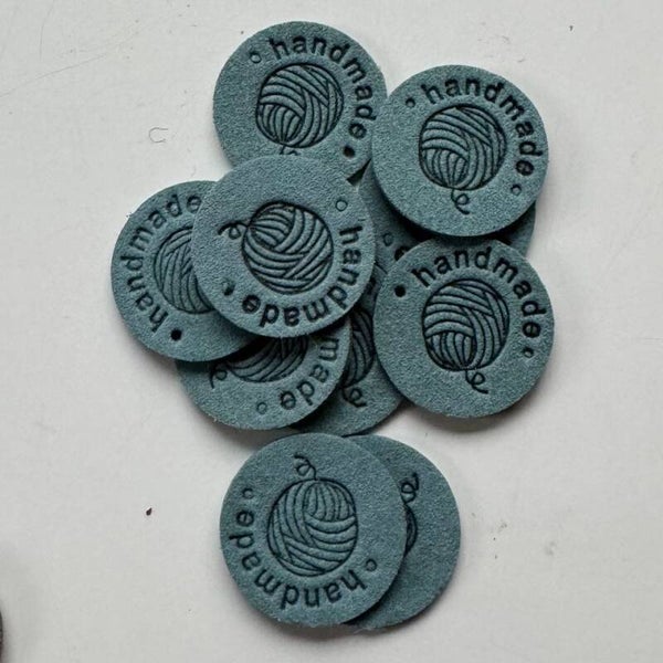 Runde Skinnlapper i ulike farger og teksten “Handmade”.